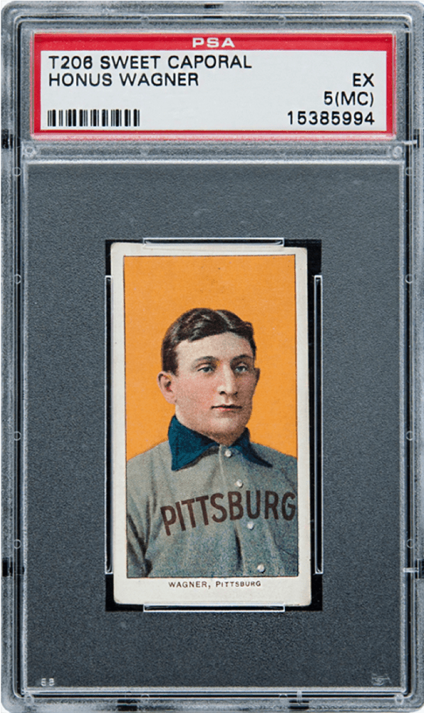 This picture is a 1909 Honus Wagner baseball card. He played for the Pittsburgh Pirates almost a century ago.